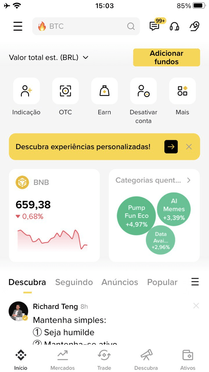 In Binance, il processo è versatile e ben organizzato. È possibile depositare tramite Pix (in Brasile), carta di credito o debito, trasferimenti P2P o inviare direttamente criptovalute al wallet. La piattaforma consente di selezionare la valuta di origine e il metodo in modo intuitivo, con cronologia delle transazioni visibile.