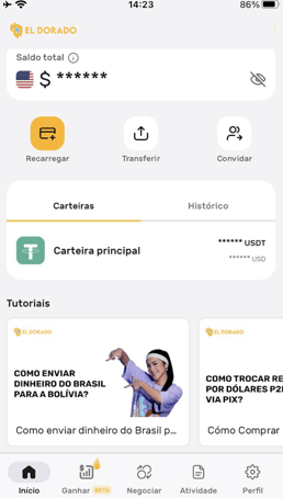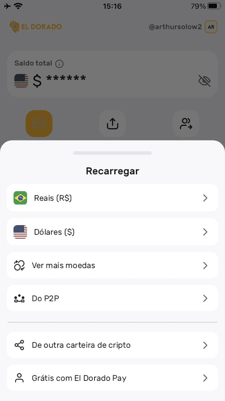 In El Dorado, il pulsante “Ricarica” offre molteplici opzioni: reali (R$), dollari (US$), altre valute (anche se quest'ultima opzione ha presentato problemi), P2P, cripto ed El Dorado Pay. Per depositare reali, l'utente viene reindirizzato a una negoziazione P2P dove deve trovare una controparte che invii USDT in cambio.