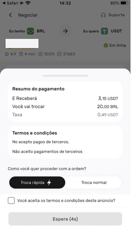 In El Dorado, il processo è stato più manuale. Dopo aver inserito l'importo, siamo entrati in una lista di offerte P2P. Abbiamo scelto una con prezzo di R$ 5,489 per USDT e abbiamo seguito questi passaggi: