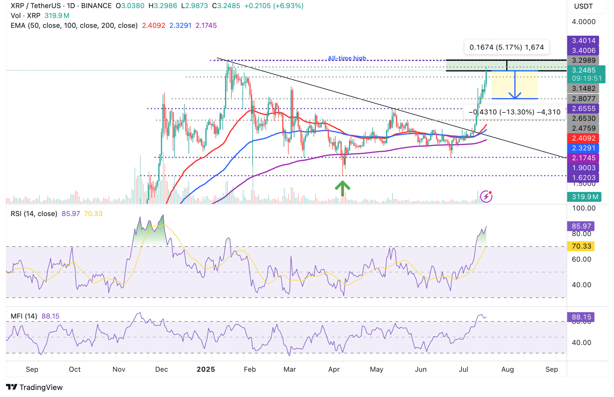 Sebbene $XRP momentum sia forte, indicatori di ipercomprato come l'RSI suggeriscono possibili correzioni a breve termine. Un breakout sopra \$3.40 potrebbe innescare una nuova scoperta dei prezzi, mentre un rifiuto potrebbe riportare il prezzo verso \$2.80.