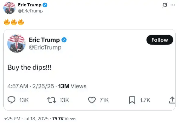 BlockBeats messaggio, 18 luglio, Eric Trump, il secondogenito di Trump, ha ripubblicato sui social media il suo post del 25 febbraio di quest'anno "Buy the dips!!!"