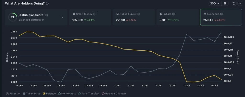 Secondo i dati di Nansen, le balene hanno aumentato le loro partecipazioni dell'11,8% negli ultimi 30 giorni, possedendo ora più di 9,19 trilioni di token, rispetto agli 8,18 trilioni di metà giugno. Questo accumulo sostenuto da mani forti è generalmente visto come un segnale estremamente rialzista nel mercato delle criptovalute.