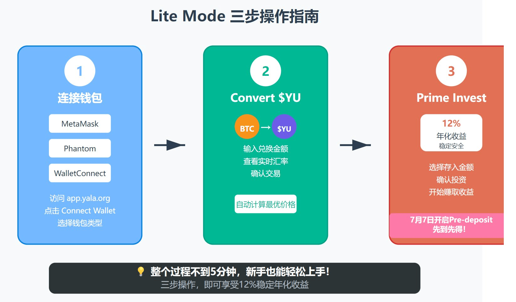 Per gli utenti senza tempo da dedicare a strategie DeFi, Yala ha introdotto la Modalità Lite - un prodotto entry-level che rende l'investimento estremamente semplice.