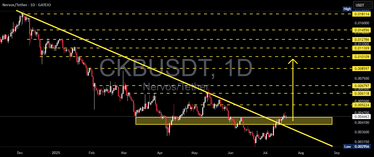 CKB sta lampeggiando uno dei suoi segnali tecnici più promettenti negli ultimi mesi. La rottura da una tendenza al ribasso a lungo termine, combinata con una forte base orizzontale, rende questo setup altamente attraente sia per i trader di swing che per i trader di posizione.