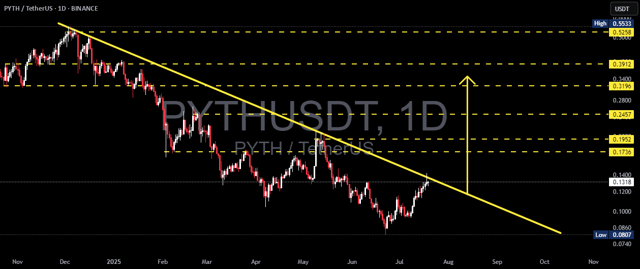 Dopo quasi 8 mesi in un forte trend al ribasso, PYTH/USDT sta ora mostrando segni di una possibile rottura della linea di tendenza. L'azione dei prezzi sta testando una resistenza discendente critica che è stata rispettata dalla fine del 2024. Questo potrebbe essere il punto di svolta per una grande inversione di tendenza.