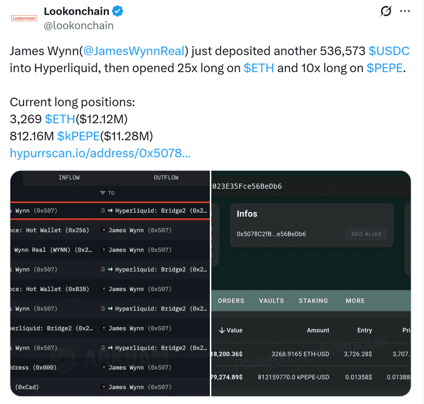James Wynn, noto per i suoi audaci scambi ad alta leva, è rientrato nell'arena crypto in modo drammatico. Secondo i dati on-chain, Wynn ha recentemente depositato 536.573 USDC in Hyperliquid, un exchange decentralizzato di perpetuals.
