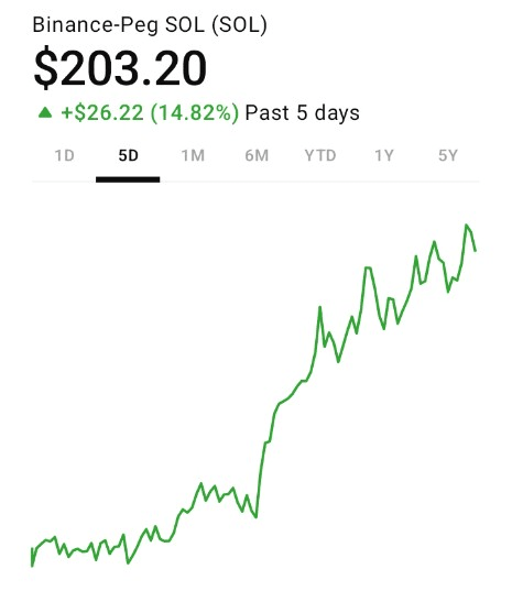 SOL è attualmente scambiato intorno a $203, con un intervallo oggi tra $195 e $206.