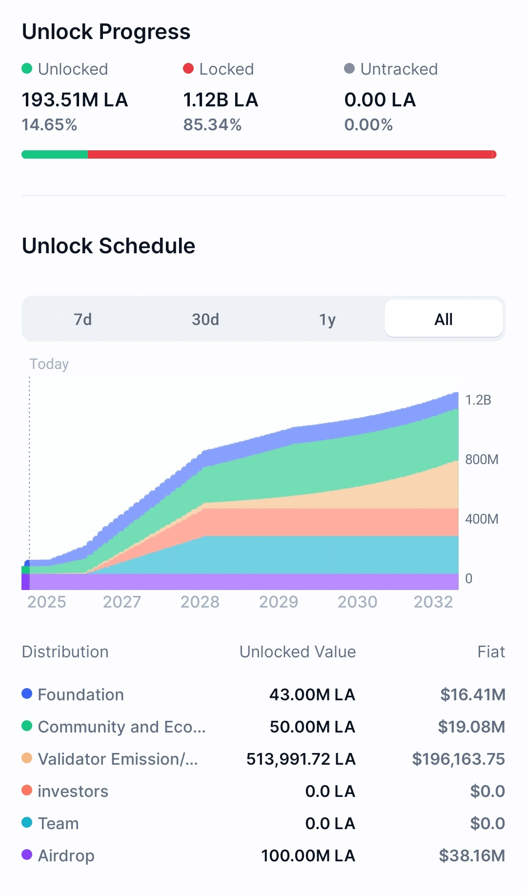 I sblocchi di $LA sono lenti e strutturati — buoni per la stabilità del prezzo se l'adozione prosegue.
