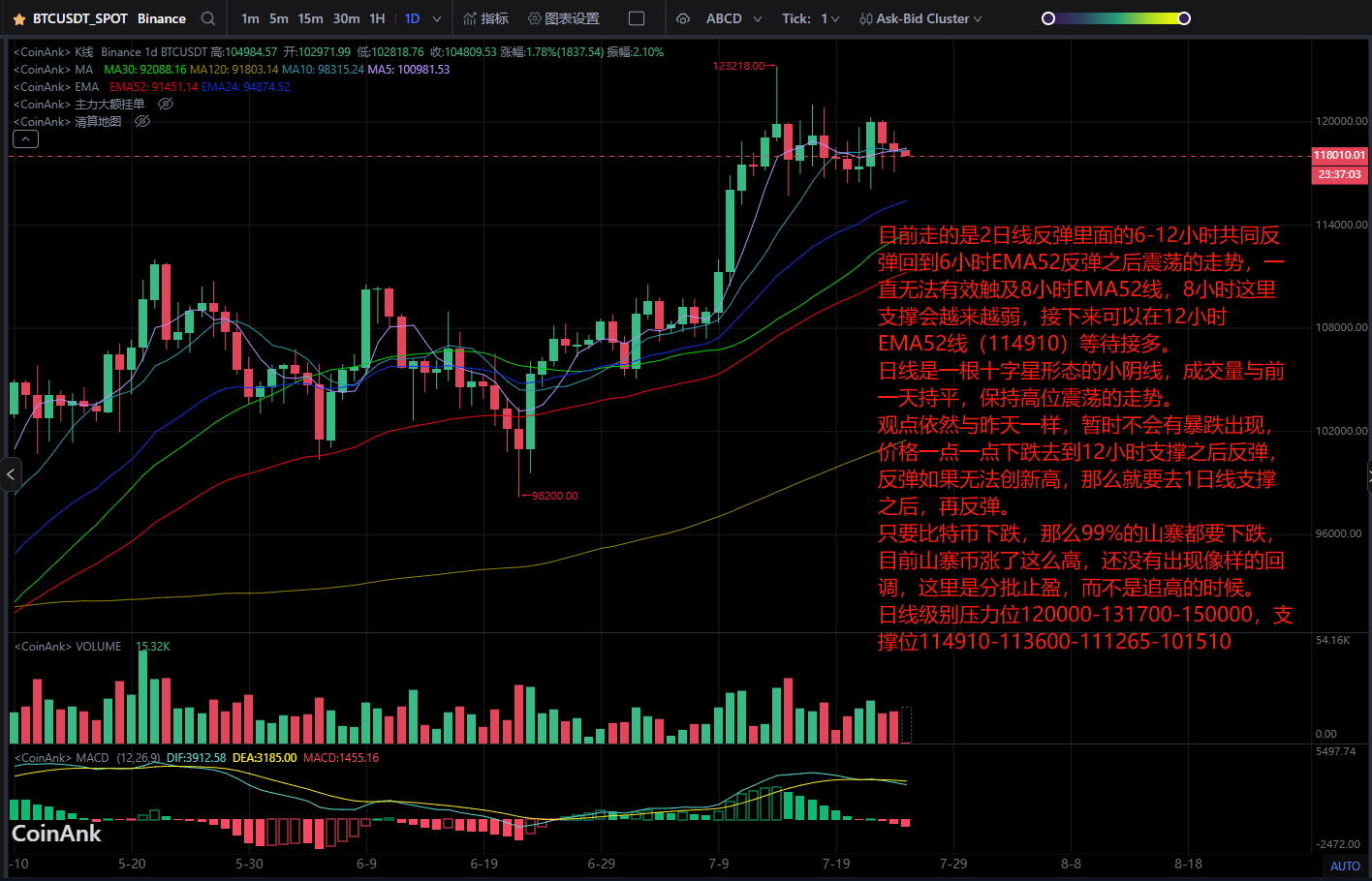 Attualmente stiamo assistendo a un rimbalzo di 6-12 ore all'interno di un rimbalzo di 2 giorni, tornando dopo il rimbalzo alla EMA52 di 6 ore e seguendo un andamento laterale. Non siamo riusciti a toccare efficacemente la linea EMA52 di 8 ore, e qui il supporto di 8 ore diventerà sempre più debole. Possiamo aspettarci di entrare long sulla linea EMA52 di 12 ore (114910).