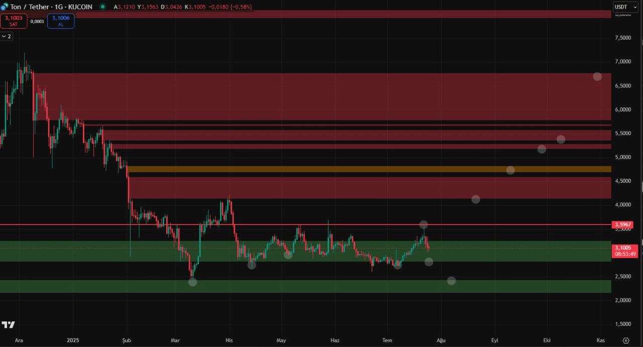 La settimana scorsa, quando è stata tentata la sfida alla resistenza, c'è stata una battuta d'arresto a causa delle condizioni di irrigidimento del mercato più ampio. A questo punto, #TON sta negoziando vicino a una linea di tendenza critica di supporto, un'area che gli acquirenti hanno frequentemente valutato nel processo di accumulo, il che indica che il prezzo sta per raggiungerlo. Gli indicatori tecnici suggeriscono che un trend rialzista potrebbe comportare un nuovo test della zona rossa di resistenza, a condizione di un contesto di mercato più positivo.