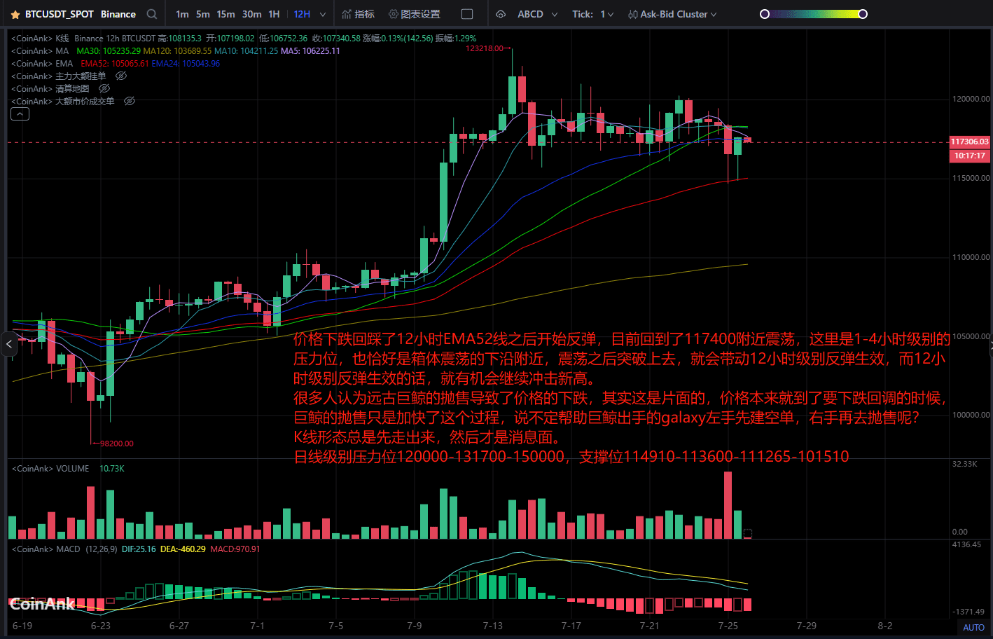 Dopo che il prezzo è sceso e ha toccato la linea EMA52 a 12 ore, ha iniziato a rimbalzare. Attualmente oscilla intorno a 117.400. Questo è il livello di pressione al livello 1-4 ore e si trova vicino al limite inferiore dell'oscillazione del box. Se rompe dopo l'oscillazione, determinerà l'entrata in vigore del rimbalzo del livello 12 ore. Se il rimbalzo del livello 12 ore avrà effetto, ci sarà la possibilità di continuare a raggiungere nuovi massimi.