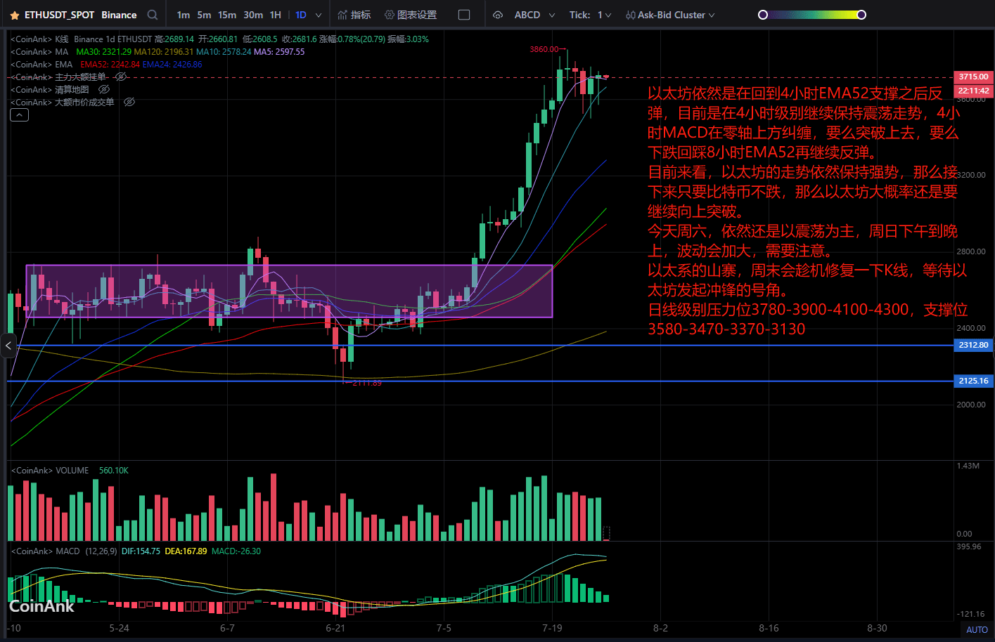 Ethereum è ancora in fase di rimbalzo dopo essere tornato al supporto dell'EMA52 a 4 ore. Attualmente continua a mantenere una tendenza di oscillazione a 4 ore, con il MACD a 4 ore che si attorciglia sopra l'asse zero; o romperà verso l'alto, o scenderà a testare di nuovo l'EMA52 a 8 ore prima di continuare a rimbalzare.