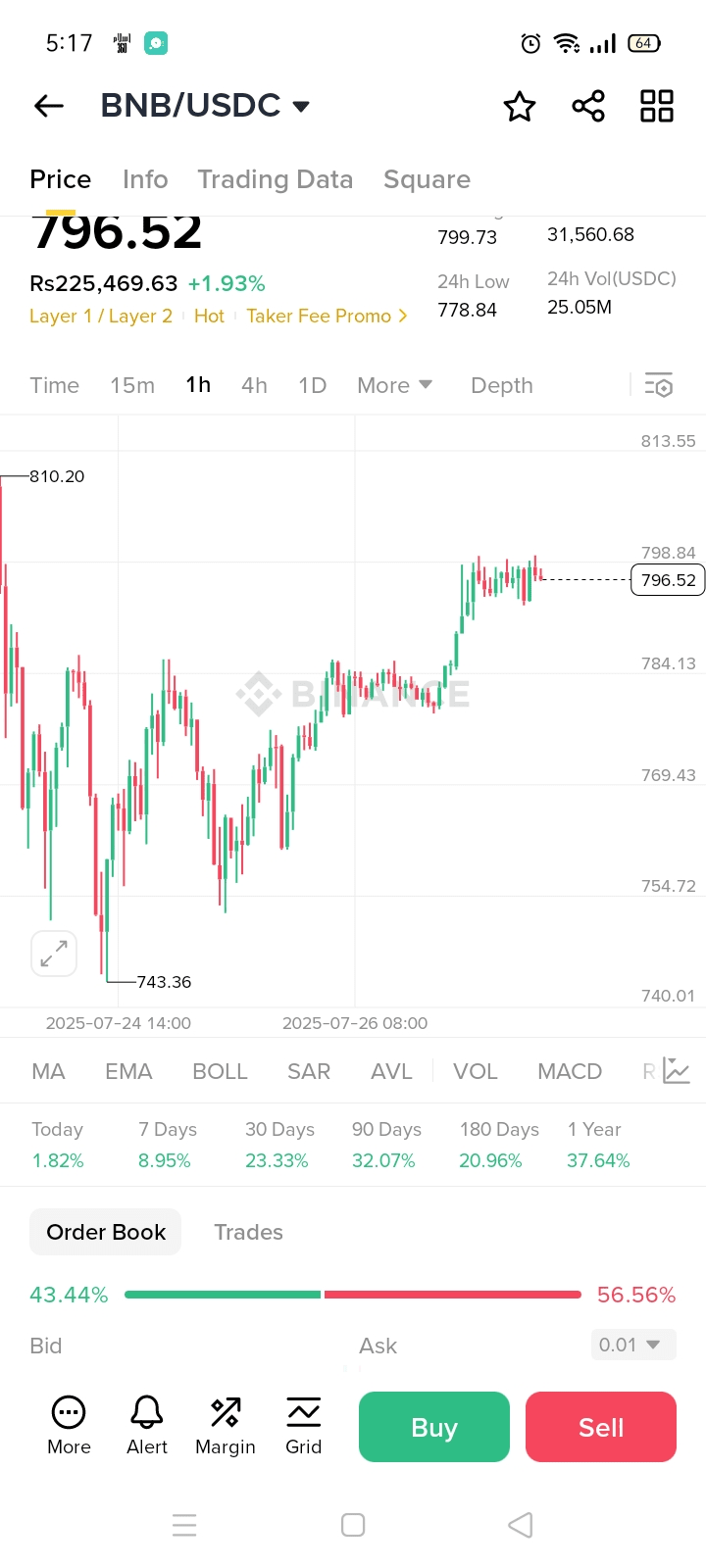 La coppia BNB/USDC sta mostrando un forte momentum rialzista mentre sale a $796.52, riflettendo un solido guadagno giornaliero di +1.93%. Con il prezzo in aumento di oltre l'8.95% questa settimana e del 23.33% nell'ultimo mese, i trader stanno osservando da vicino un potenziale breakout.