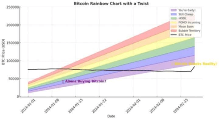 Storicamente, il Bitcoin si muove all'interno delle bande colorate, che vanno da “Saldi Fiammeggianti” (è tempo di comprare!) a “Territorio delle Bolle” (fate attenzione, moonboys!). Ma come possiamo vedere nell'ultimo grafico, il Bitcoin ha completamente ignorato le leggi fisiche dell'arcobaleno, volando in una zona sconosciuta dove non abbiamo dati per prevedere cosa accadrà dopo. 🤯📊