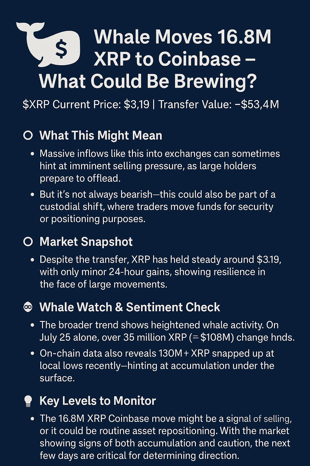La balena ha spostato 16,8 milioni di XRP (~53 milioni di dollari) su Coinbase → possibile vendita in arrivo.