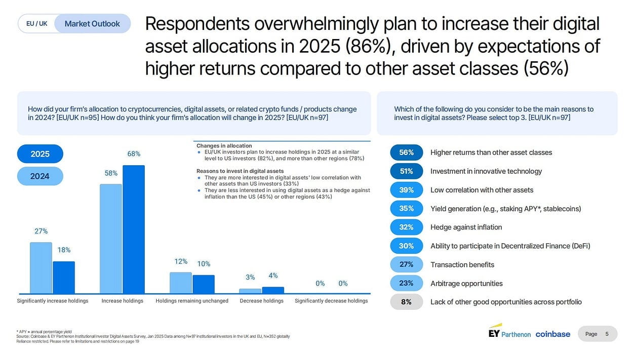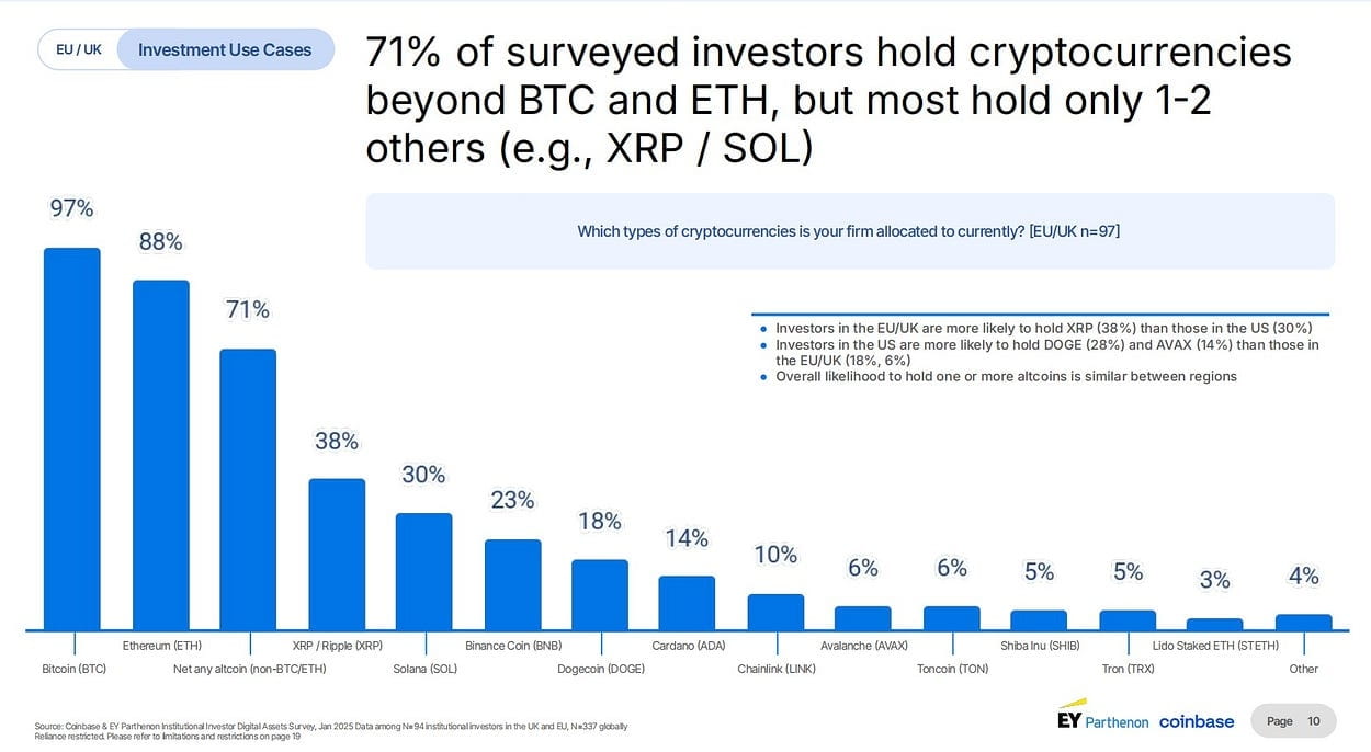 - Questo riepilogo proviene da un'indagine del 2025 condotta da Coinbase e EY-Parthenon che ha intervistato circa 100 grandi organizzazioni d'investimento (come banche e fondi pensione) nell'UE e nel Regno Unito riguardo l'interesse per le valute digitali e gli investimenti, noti anche come criptovalute o asset digitali.