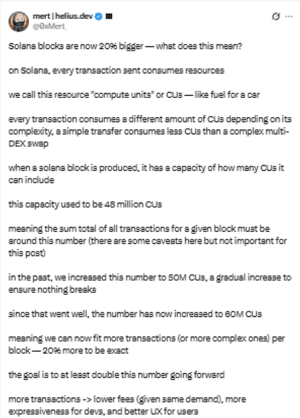 Il tempismo non è casuale. Solana ha appena aggiornato la sua rete il 22 luglio, aumentando la capacità dei blocchi del 20% a 60 milioni di unità di calcolo. Mert Mumtaz di Helius ha spiegato su X che questo consente alla rete di gestire molte più transazioni per blocco. Pensala come aggiungere più corsie a un'autostrada.