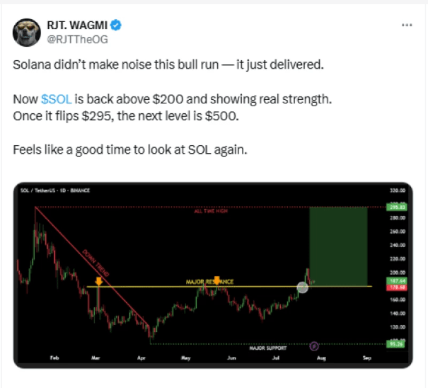 A 187,19 dollari, SOL ha una capitalizzazione di mercato di 100 miliardi di dollari e sta mirando ai prossimi ostacoli a 192 e 205 dollari. Ma qui è dove diventa interessante: se riesce a superare quei livelli, gli analisti pensano che 220 dollari siano assolutamente fattibili.