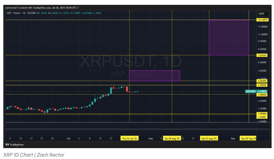 Nel frattempo, Rector crede che l'intervallo di $4 a $5 sarà solo il punto di partenza. L'esperto di mercato ha posizionato la sua seconda regione target intorno al livello di prezzo di $7 a $15. Secondo Rector, XRP probabilmente rivendicherà questa regione di $7 a $15 entro il 7 settembre 2025, sei settimane da ora.