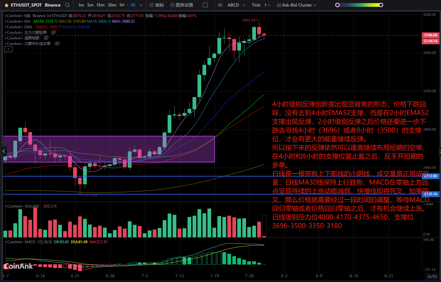 Il livello a 4 ore è rimbalzato a un nuovo massimo e ha formato un pattern di divergenza superiore. Il prezzo è sceso e ha ritracciato, ma non ha raggiunto il supporto EMA52 a 4 ore. Invece, è rimbalzato al supporto EMA52 a 2 ore. Dopo il rimbalzo del livello a 2 ore, il prezzo dovrà scendere ulteriormente per trovare il livello di supporto a 4 ore (3696) o a 8 ore (3500) prima di avere maggiore energia per continuare a rimbalzare.