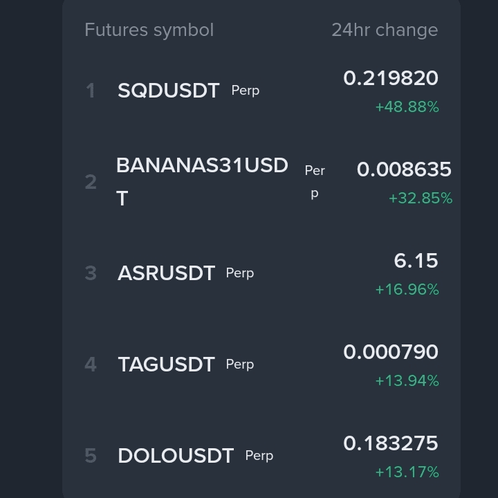 I seguenti sono i simboli dei futures con i più forti aumenti di prezzo nelle ultime 24 ore.#SQD #BANNANA Queste monete hanno registrato un notevole slancio al rialzo$SQD e hanno sovraperformato altre in termini di guadagni percentuali, riflettendo una significativa attività rialzista nel mercato durante questo periodo.#ARSUSDT
