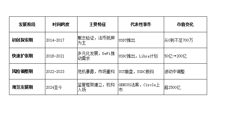 Le stablecoin, come innovazione importante nel campo delle criptovalute, sono passate da strumenti marginali nel trading di asset digitali a diventare un ponte tra la finanza tradizionale e l'economia crittografica. La storia dello sviluppo delle stablecoin è una cronaca condensata dell'innovazione finanziaria, documentando la continua esplorazione nel campo delle criptovalute per affrontare il problema della volatilità dei prezzi. Dalla sua nascita nel 2014, le stablecoin hanno subito molteplici iterazioni e prove di mercato, e il loro percorso di sviluppo riflette l'intero processo di transizione dell'industria delle criptovalute da marginale a mainstream. Questo percorso evolutivo può essere chiaramente suddiviso in quattro fasi chiave, ciascuna con la propria logica di sviluppo e caratteristiche di mercato uniche.