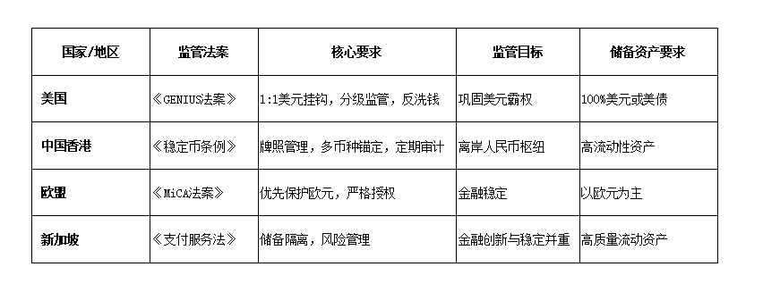 Con l'espansione della dimensione del mercato delle stablecoin, il quadro normativo globale sta diventando sempre più chiaro, ma esistono differenze significative nella filosofia di regolamentazione tra paesi e regioni. Il (GENIUS Act) approvato negli Stati Uniti nel 2025 rappresenta il primo quadro normativo federale per le stablecoin, richiedendo che le stablecoin siano ancorate al dollaro in un rapporto 1:1, con le riserve costituite da dollari o titoli di stato americani, implementando una regolamentazione a livelli: gli emittenti con oltre 10 miliardi di dollari sono direttamente regolati dalla Federal Reserve, mentre gli altri sono regolati a livello statale.