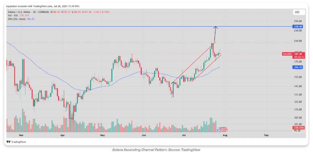 Mentre il dibattito continua, il prezzo di Solana (SOL) stesso sta formando un pattern tecnico rialzista. Sul suo grafico giornaliero, SOL ha formato un classico canale ascendente, che riflette un trend di crescita costante. Se il pattern regge, potrebbe segnalare un potenziale aumento del prezzo del 27% dal suo livello attuale.