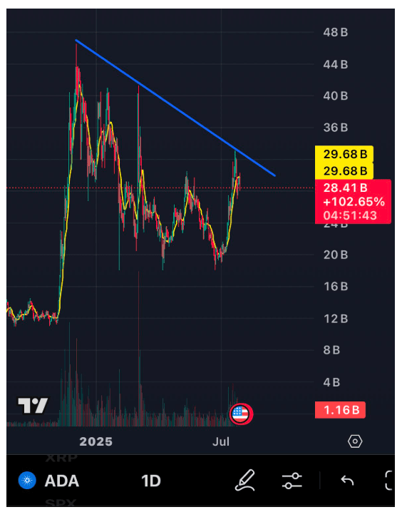 Aggiungendo al sentimento rialzista, Crypto King ha definito il grafico di ADA a 1 giorno "una gioia da osservare." Ha evidenziato un livello chiave di resistenza e ha accennato a una massiccia rottura all'orizzonte. Secondo lui, una volta che questo livello cede, ADA potrebbe salire a almeno $1.4–$1.6, con un nuovo massimo storico potenzialmente programmato nel prossimo futuro.