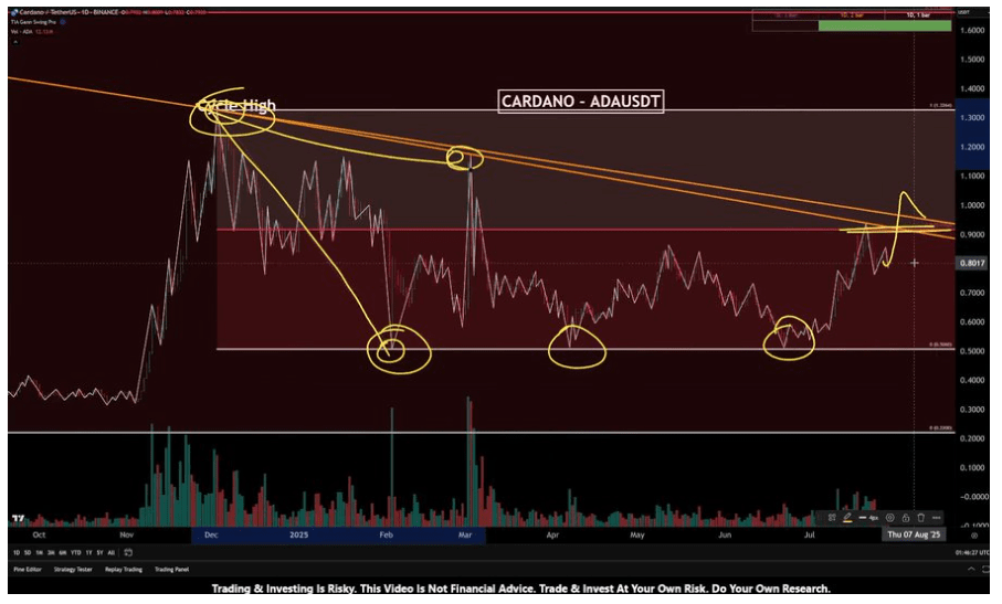 Michael crede che Cardano abbia potenziale se e quando tornerà sopra $0.95. Considera questa area come il punto di mezzo dal dicembre dello scorso anno alla correzione di febbraio 2025.