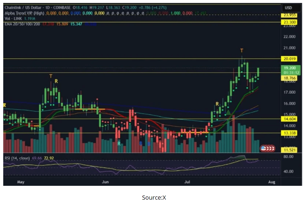 La tendenza è iniziata all'inizio di luglio quando LINK ha superato la resistenza di 14,60 dollari. Da allora, il token ha guadagnato slancio, superando più livelli con una crescente fiducia degli acquirenti. I movimenti previsti riflettono un cambiamento nel sentiment in cui il token ora scambia in un ambiente dove gli acquirenti sono disposti a entrare nei ribassi e mantenere il controllo sopra le medie mobili esponenziali chiave.