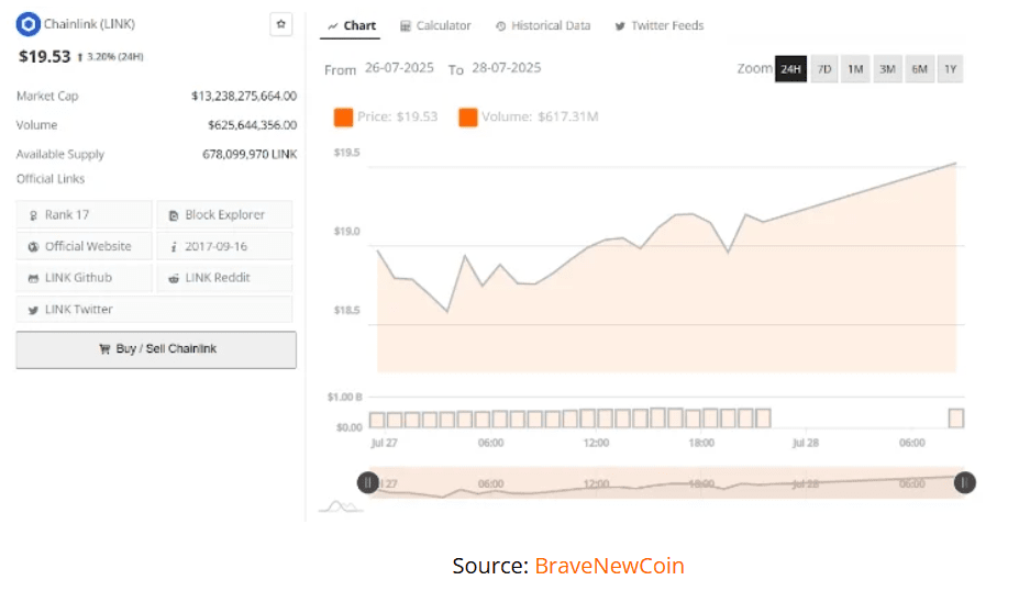 Chainlink (LINK) ha registrato una forte azione di prezzo al rialzo nelle ultime 48 ore, superando il livello di 19,00 dollari dopo un breakout pulito da una resistenza chiave. Il prezzo di Chainlink è aumentato del 3,20% per chiudere a 19,53 dollari, mostrando una continuazione del momentum rialzista iniziato all'inizio di luglio.