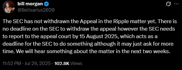 Il rinomato avvocato crypto Bill Morgan, che ha seguito da vicino la causa Ripple-SEC, ha confermato che la SEC non ha ritirato il suo appello. Sebbene l'agenzia non sia vincolata da una scadenza rigida, ci si aspetta che aggiorni la corte d'appello entro il 15 agosto 2025.