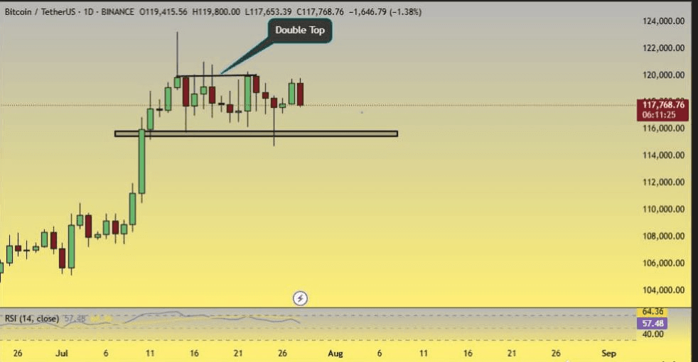 Bitcoin si è consolidato in un intervallo ristretto tra 116.000 e 120.000 negli ultimi 13 giorni. Compratori e venditori sono in stallo, con un forte supporto vicino a 115.800 che rimane solido.