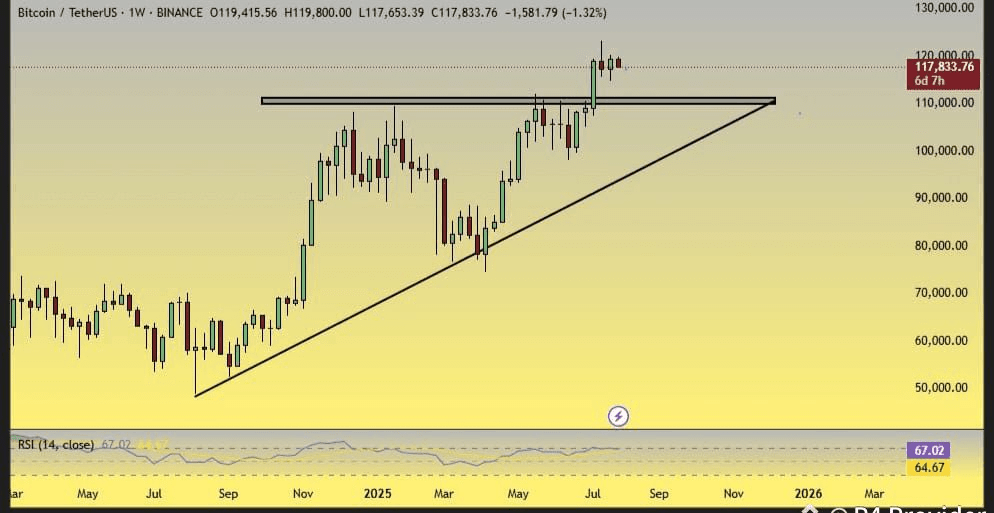 L'immagine più ampia rimane rialzista, ma la candela settimanale attuale mostra segni di pressione di vendita. Il supporto chiave a 110.000 rimane critico: se quel livello si rompe, potrebbe seguire una correzione più profonda. Finché BTC scambia sopra questa linea, il trend rialzista più ampio rimane valido.