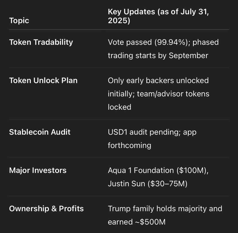 * ✅Il 16 luglio, i detentori di token WLFI hanno votato all'unanimità—99.94% a favore—per consentire al token di diventare commerciabile sui mercati secondari e sulle piattaforme peer-to-peer.