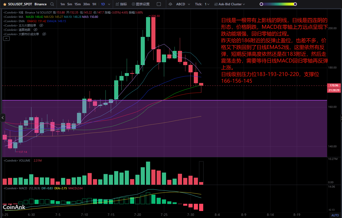 Relativamente parlando, la candela mensile di SOL si comporta piuttosto bene, anche se non è forte come Ethereum e Bitcoin, ma l'andamento laterale al rialzo è molto sano, presenta lunghe ombre superiori e inferiori, che è anche un riflesso della divergenza di capitale, e i titoli stanno cambiando mano.