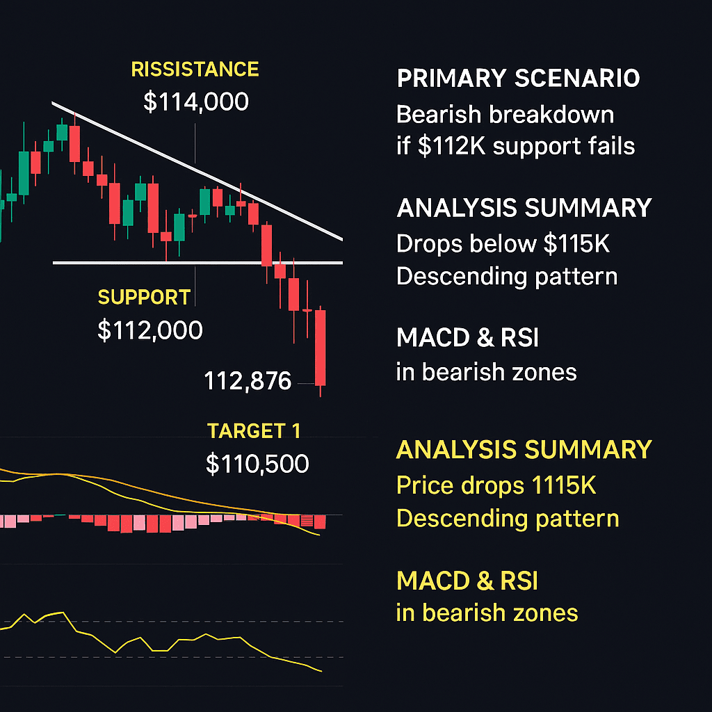BTC è passato a una fase di momentum ribassista dopo aver violato i supporti chiave. Anche se un rimbalzo è possibile, la continuazione ribassista verso $110K rimane lo scenario con probabilità più alta a meno che BTC non recuperi rapidamente $114K con forza. Fai attenzione e verifica i segnali prima di entrare in posizione.