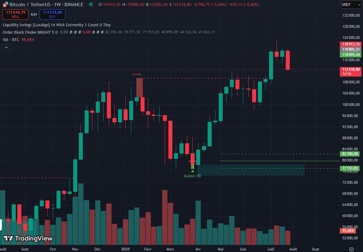 La forte candela ribassista di questa settimana ha rotto il supporto della settimana precedente a 116K.