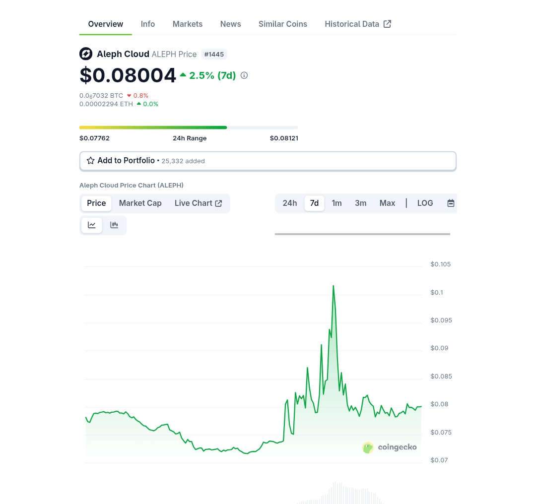 Aleph Cloud continua a crescere nel settore e guadagnare rilevanza, con una forte performance del token la scorsa settimana. Hanno recentemente introdotto GPU per uso on-demand, consentendo agli sviluppatori di distribuire VM private, agenti AI e carichi di lavoro GPU con il pieno controllo sui propri dati, codice e infrastruttura. Questi sviluppi sottolineano l'impegno di Aleph Cloud a fornire soluzioni scalabili, accessibili e sicure per l'ecosistema Web3.