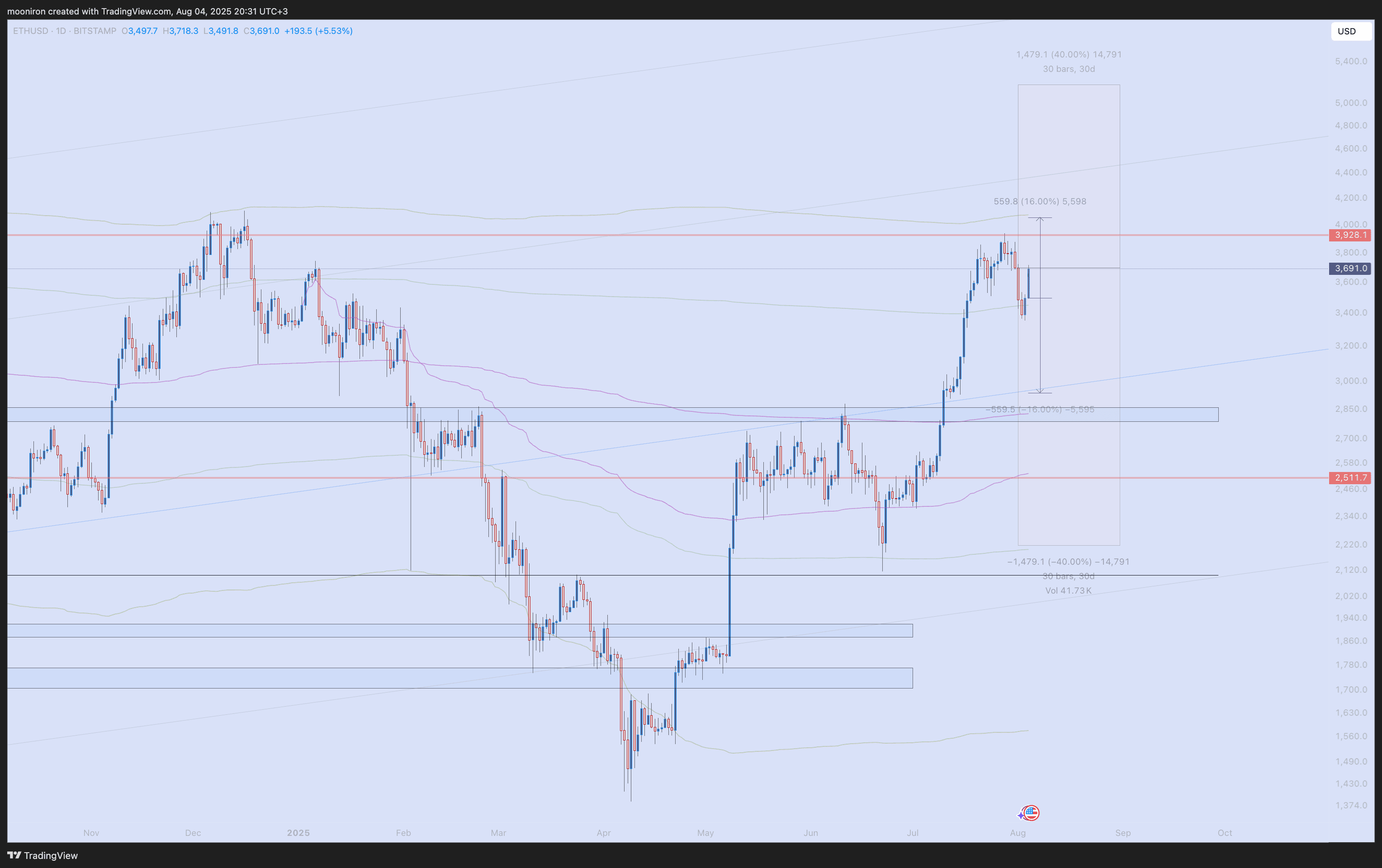 Per ETH, le medie storiche di agosto indicano una volatilità più elevata rispetto a BTC, con un 40% mensile che indica un intervallo di 5200-2200, e un 16% settimanale che indica un intervallo di prezzo di 2950-4050. Per i trader intraday, con una media giornaliera del 5,5%, è possibile effettuare buoni scambi intraday.
