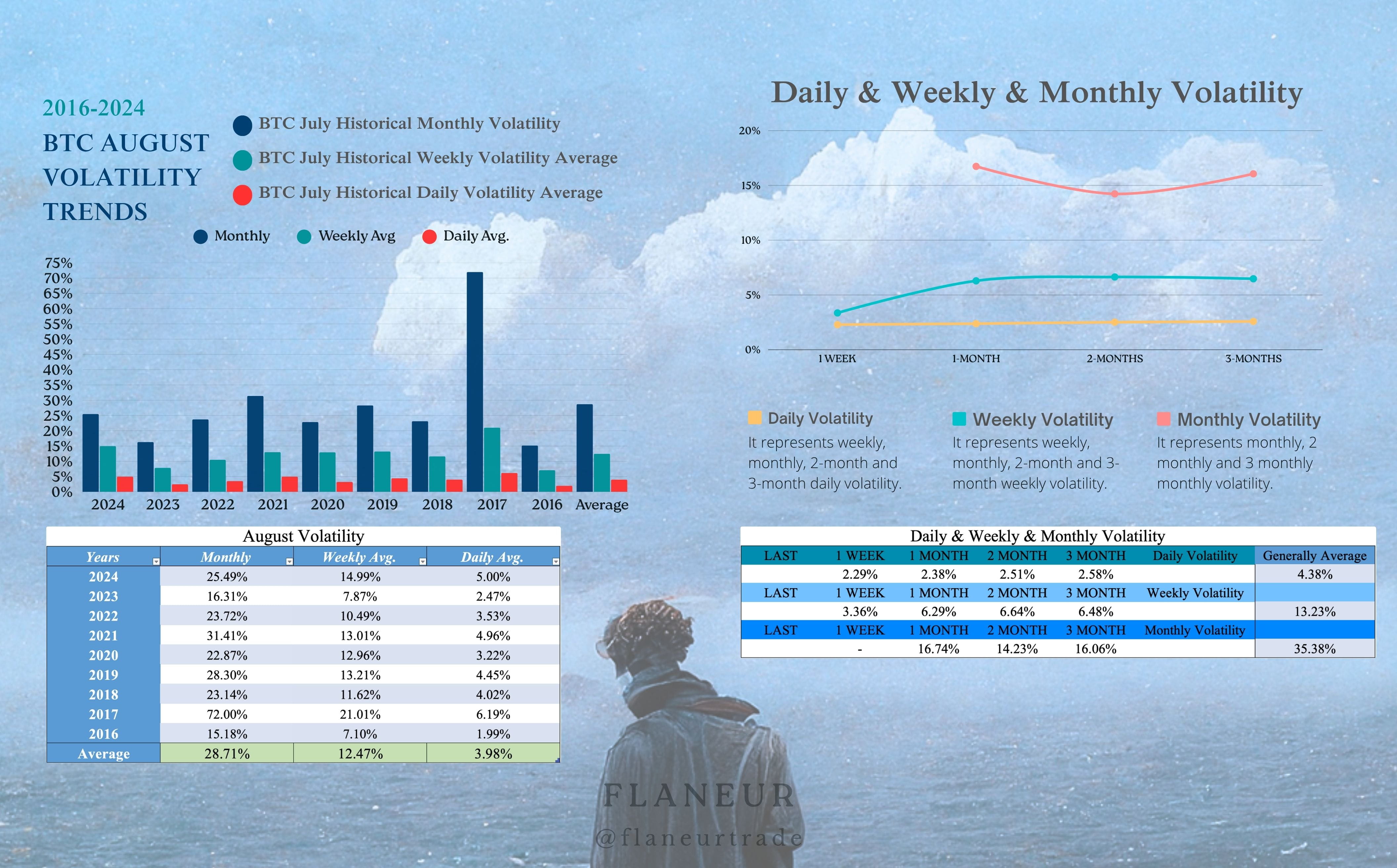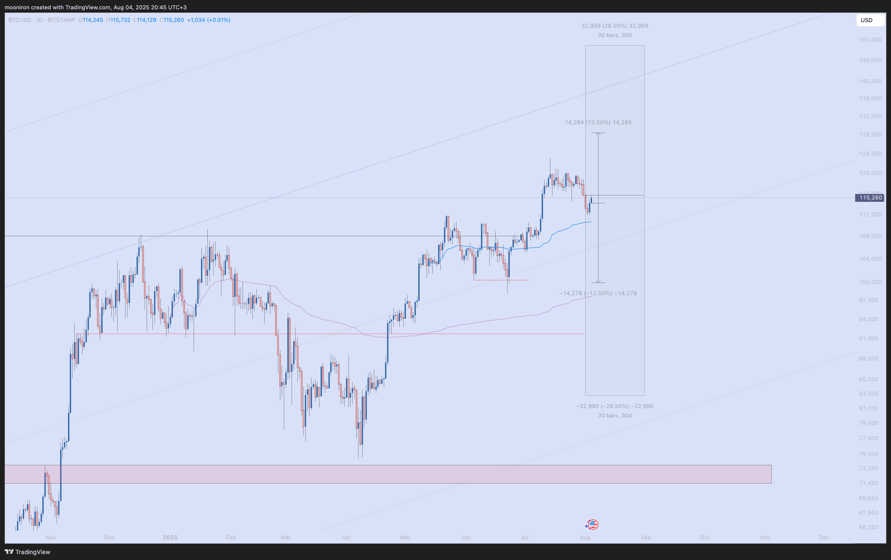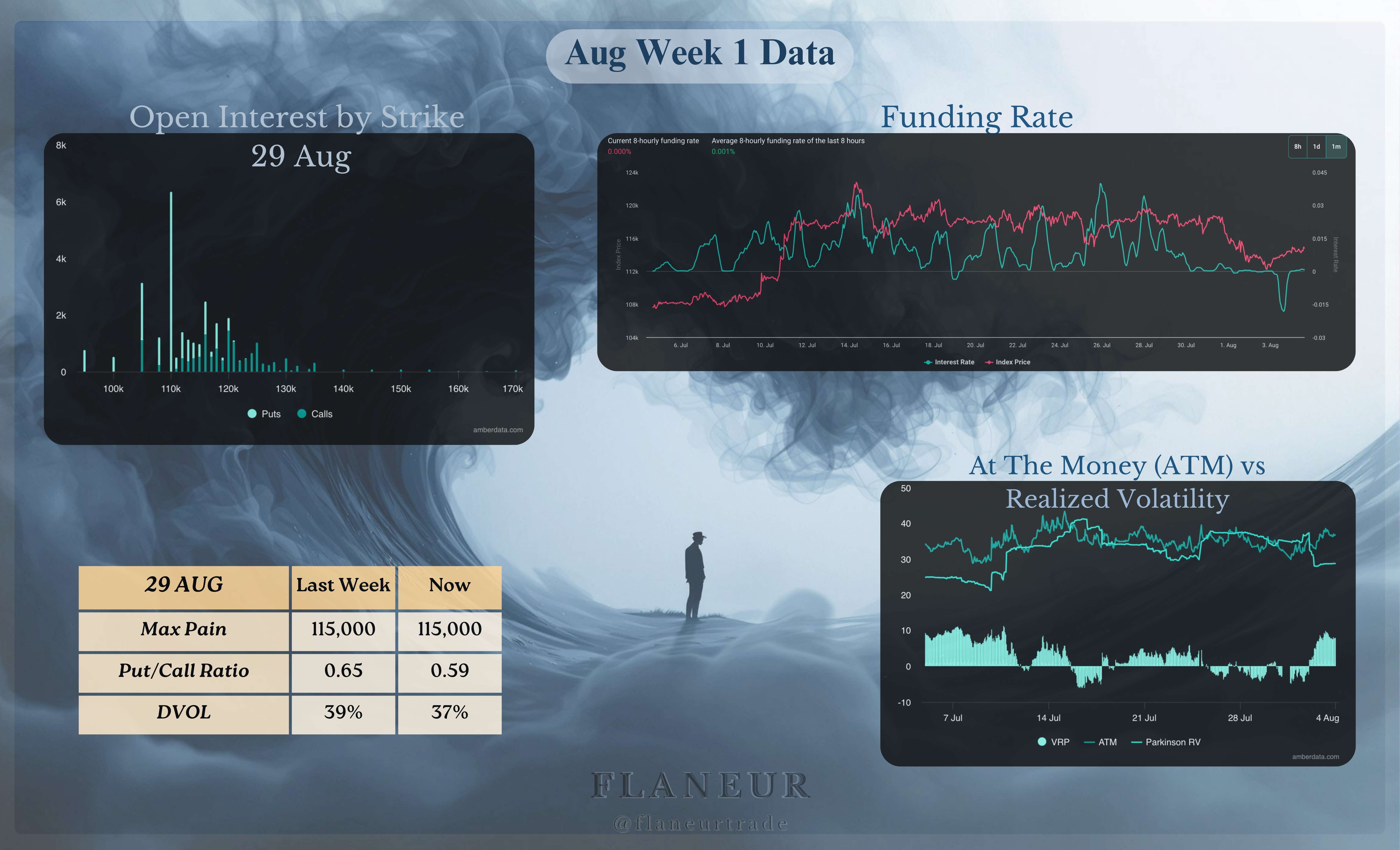 Guardando i dati storici per agosto, la volatilità media mensile di BTC è di circa il 29%, la media settimanale del 12%. Questo fornisce un intervallo di prezzo mensile di 83k-148k e settimanale 100k-128k.