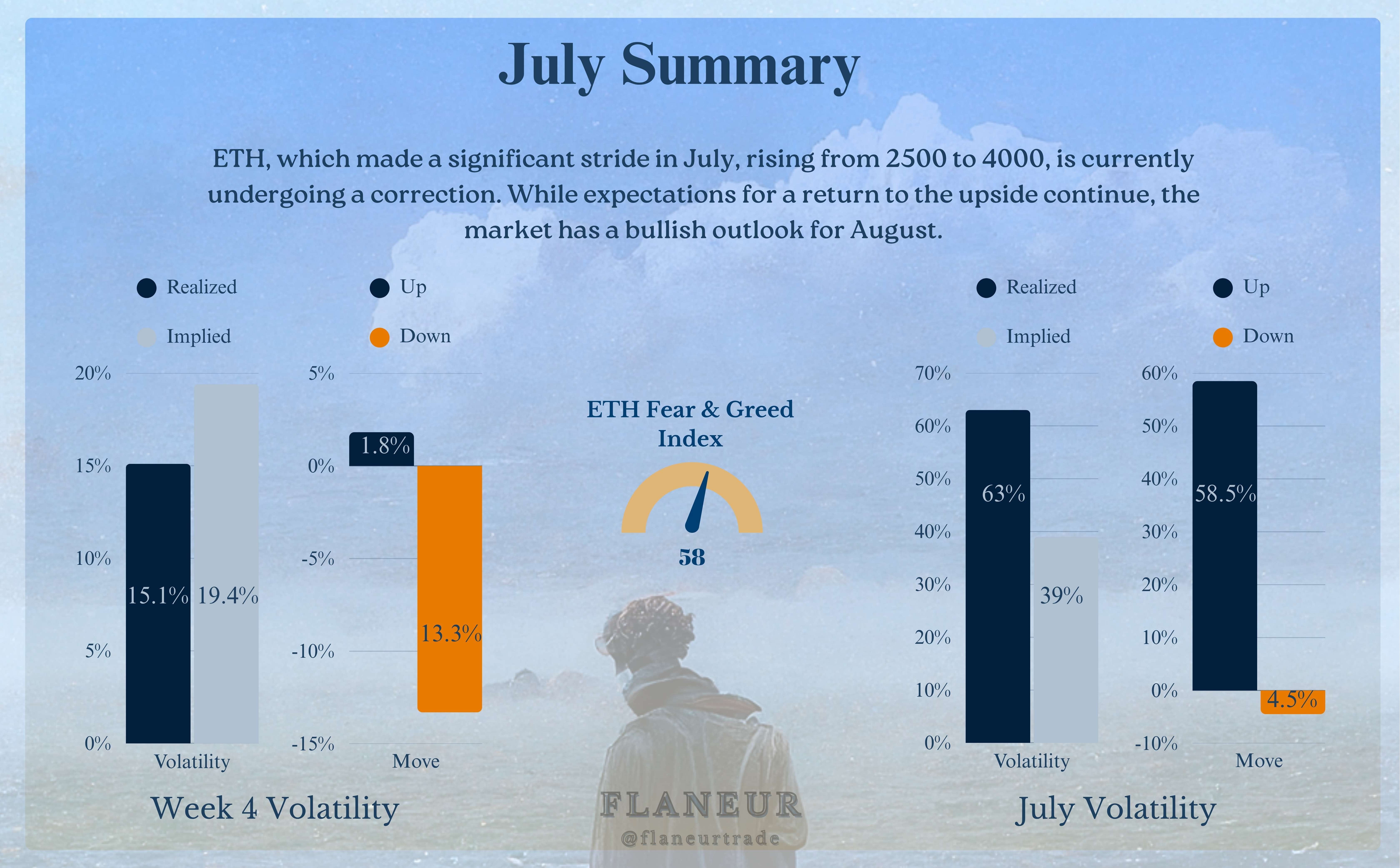 Dopo questo forte aumento, due scenari si distinguono per agosto: Prima, sperimentare un certo raffreddamento insieme a BTC e un movimento di correzione verso la regione di $3,000-$3,100. Secondo, approfittare del movimento laterale di BTC e tentare nuovi picchi con denaro che fluisce verso le altcoin. La mia aspettativa è che i prezzi si muovano più lateralmente e correttivamente per tutto il mese, con un'attività potenziale che si concentra verso la fine del mese.