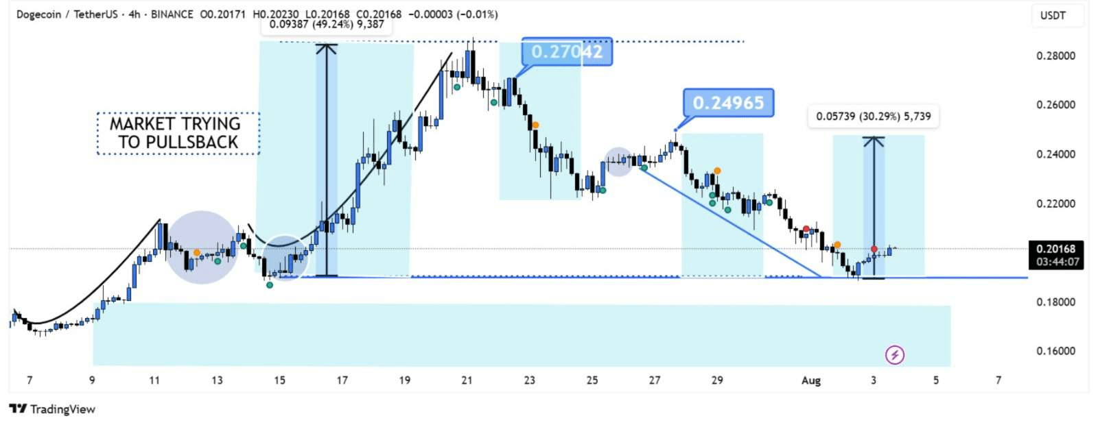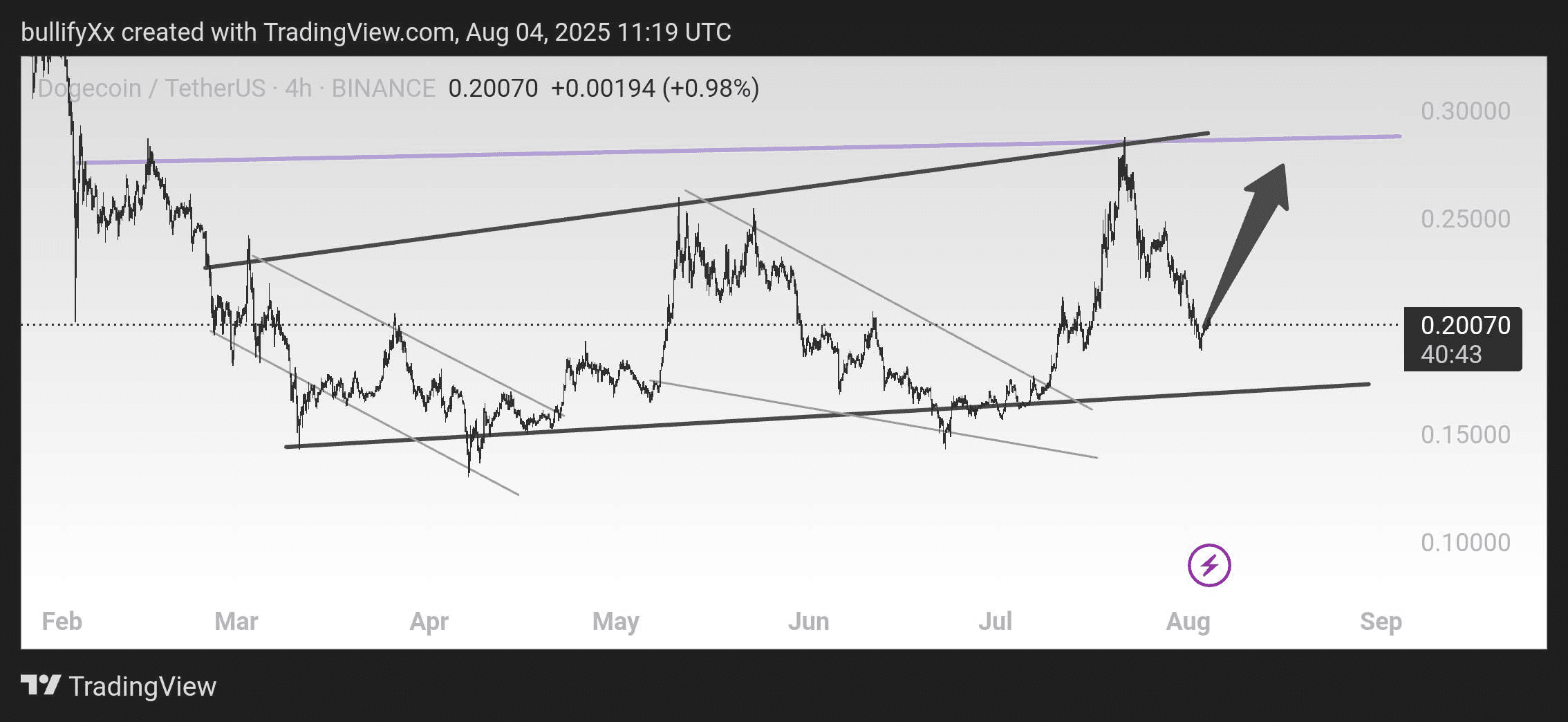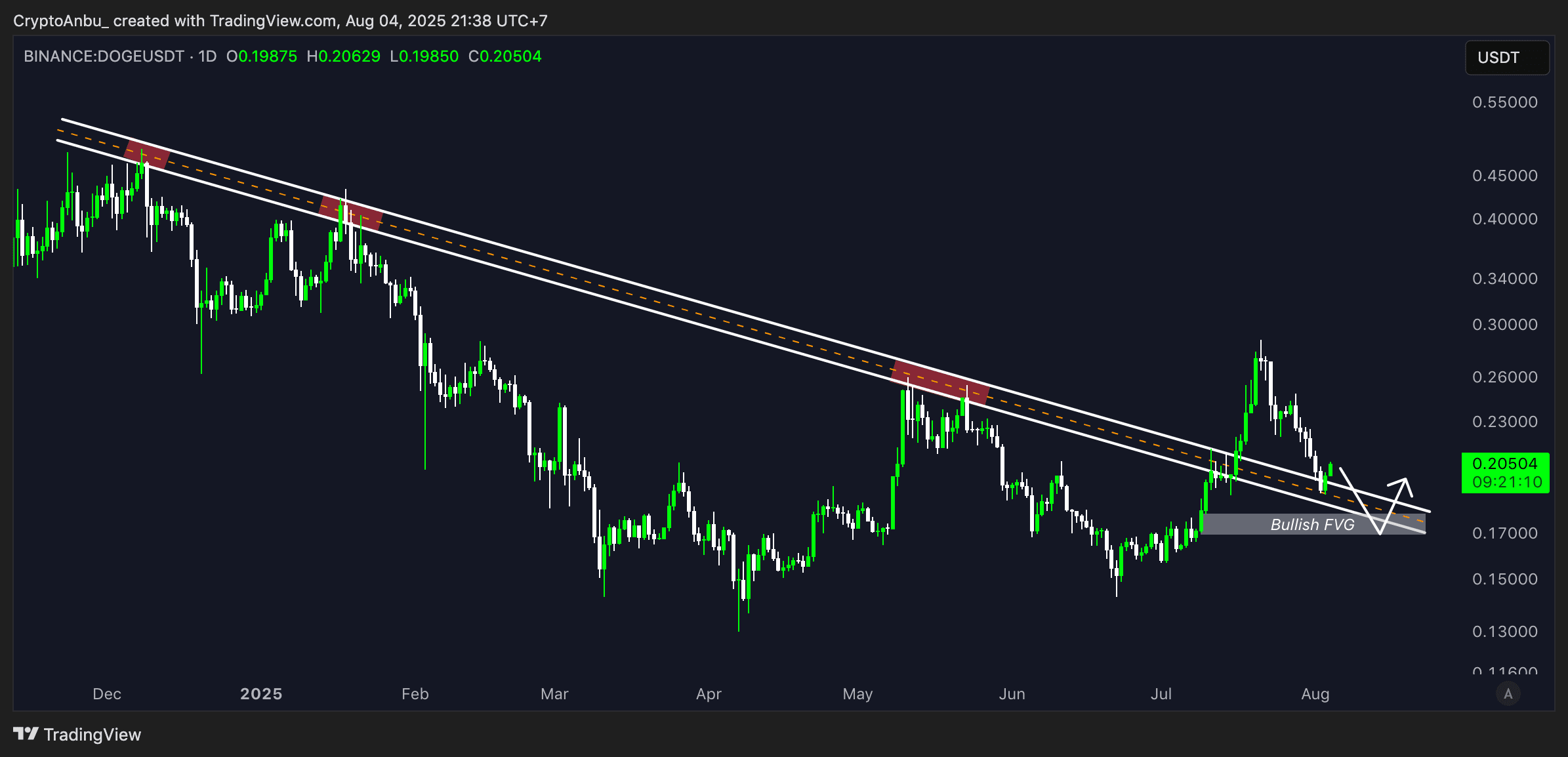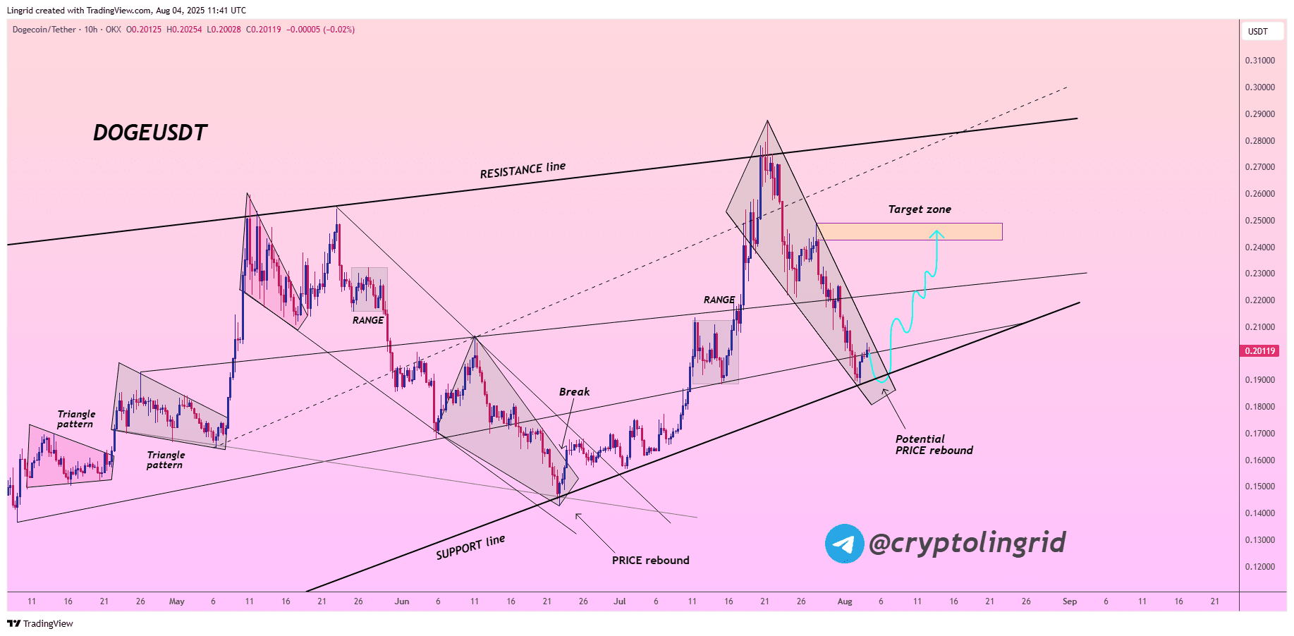 🪙$DOGE attualmente sta rimbalzando da una linea di supporto chiave dopo aver completato una formazione a cuneo discendente. In precedenti occasioni, schemi simili vicino a questa zona hanno portato a forti rialzi verso il canale di resistenza superiore. Il prezzo ora oscilla poco sopra $0.2000, tentando di costruire una struttura di minimo più alto. Un breakout sopra l'area $0.2150–0.2200 potrebbe accendere un slancio rialzista verso il target di $0.2500.