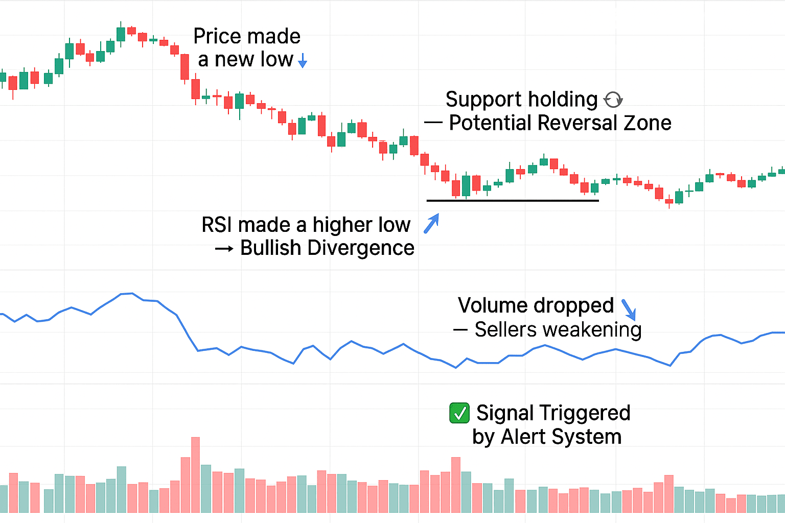 La divergenza RSI e l'esaurimento del volume si combinano per rivelare la debolezza della tendenza. Riconoscerli presto ti aiuta a prepararti prima che il mercato confermi la direzione.