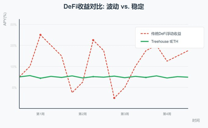 Per far capire meglio a tutti, è stata creata un'immagine per confrontare i rendimenti tradizionali di DeFi con i rendimenti fissi forniti da Treehouse; la differenza tra fluttuazione e stabilità è evidente.