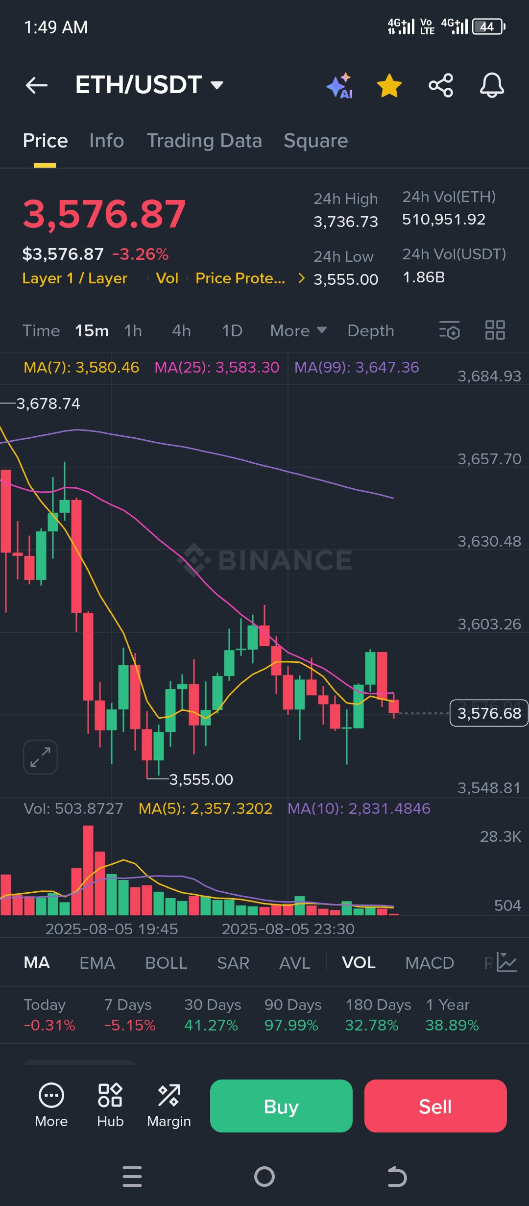 Ethereum (ETH) è ancora una volta al centro dell'attenzione dopo un forte calo intraday, attualmente scambiato a $3.576,87, in calo del 3,26% nelle ultime 24 ore. L'intervallo di 24 ore mostra un minimo di $3.555 e un massimo di $3.736, suscitando dibattito: