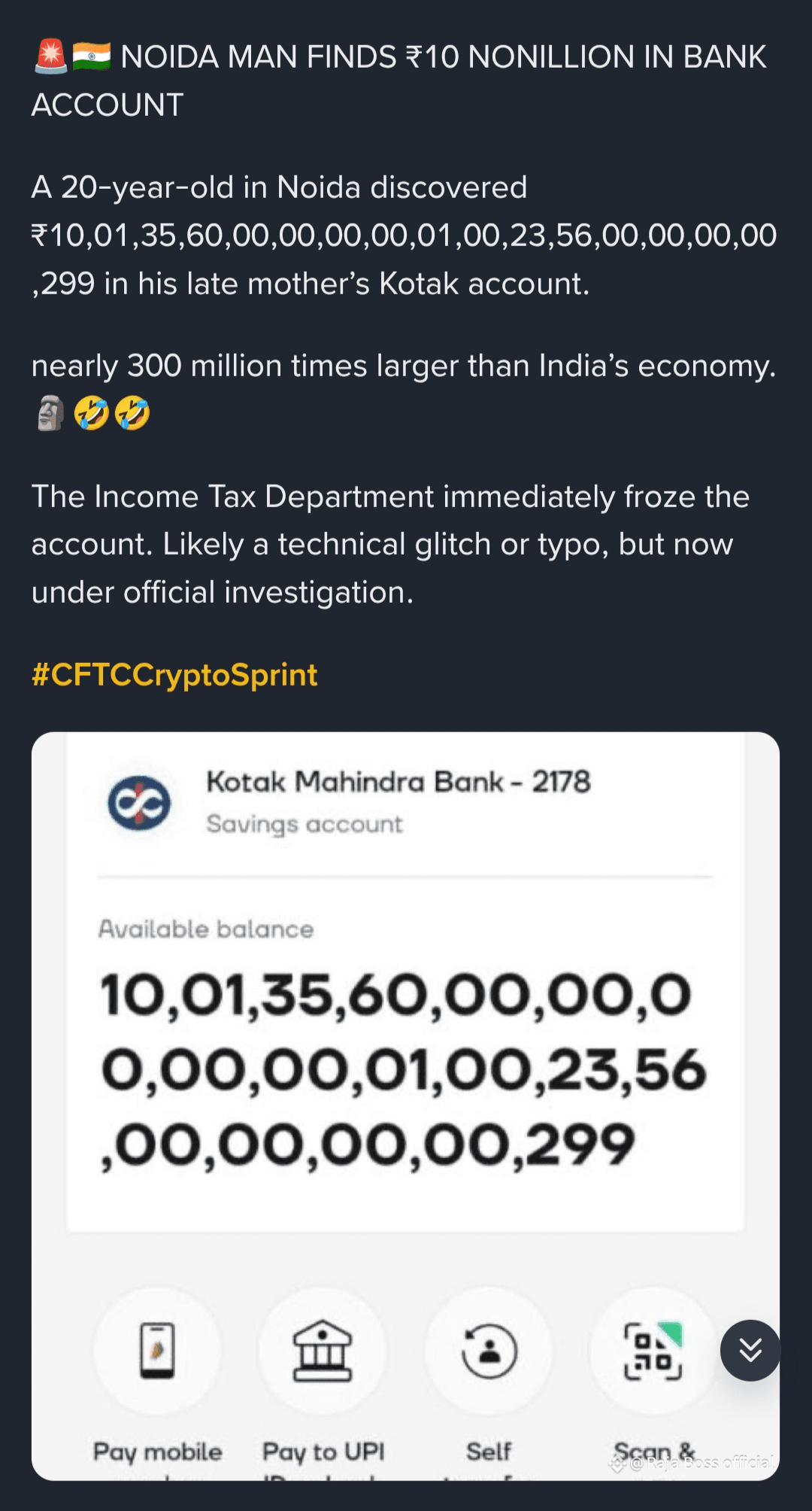 Molti post affermavano che un uomo di Noida aveva scoperto ₹10-nonillion (un numero a 37 cifre) nel conto della madre defunta presso Kotak Mahindra Bank, suggerendo qualcosa di folle come 1 septillion-trillion di rupie.