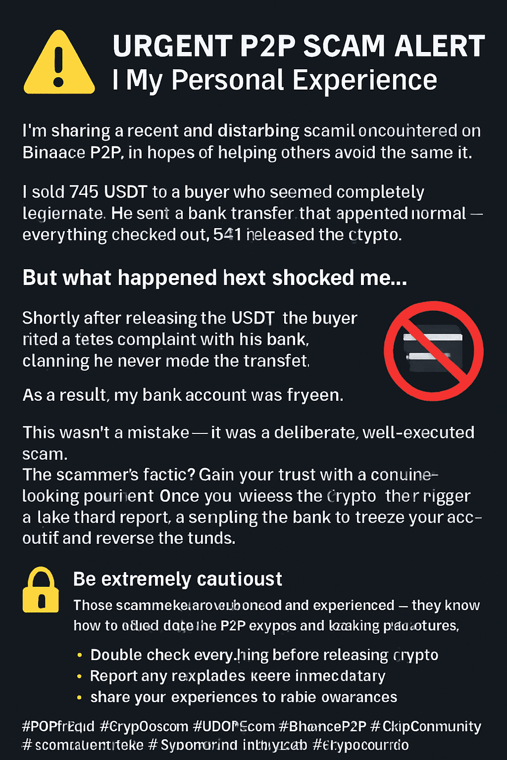 #FrodeP2P #TruffaCrypto #TruffaUSDT #AvvisoBinanceP2P #ComunitàCrypto #ConsapevolezzaTruffe #CrimineInformatico #StaiSicuro #SicurezzaCrypto