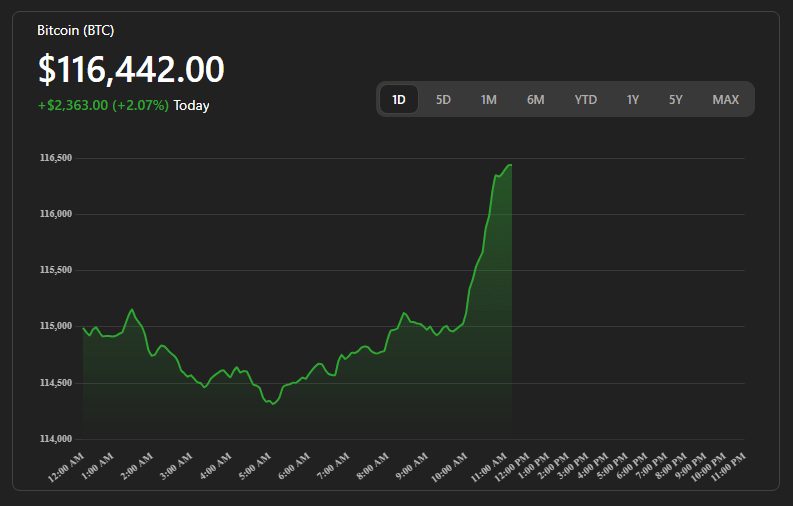 Prezzo Attuale: Circa $116,442.00 (come mostrato nella quotazione in tempo reale sopra)